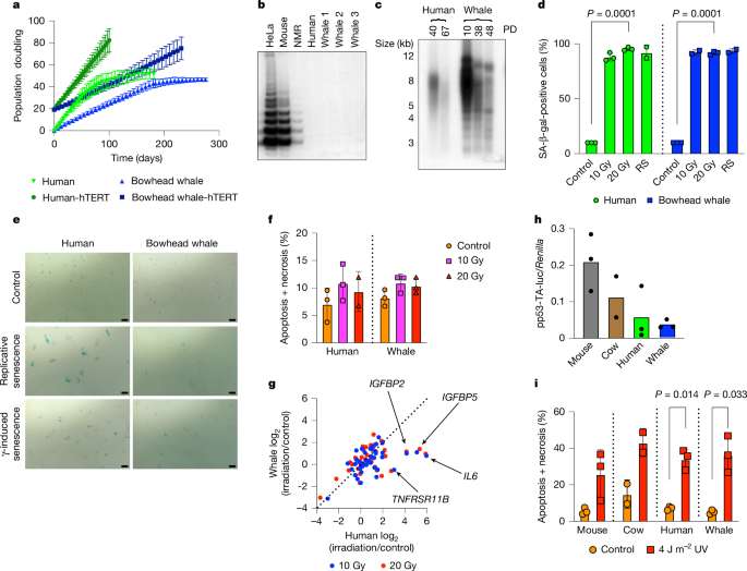 • Bowhead skin fibroblasts undergo normal replicative senescence, lack telomerase activity in most tissues and show an attenuated SASP (less inflammatory senescent phenotype) relative to human cells.