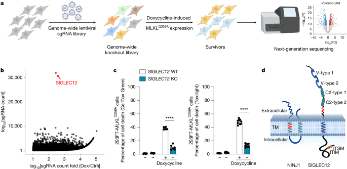 1. A genome-wide CRISPR screen in MLKL-activated human cells flagged SIGLEC12 as the top hit protecting cells from MLKL-driven death when knocked out.