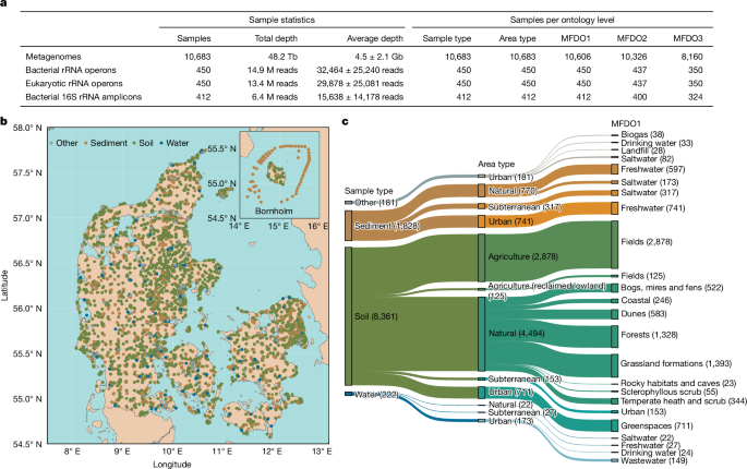 The Microflora Danica (MFD) project delivers a national atlas of environmental microbiomes across Denmark. The resource combines 10,683 metagenomic samples (Illumina shotgun; total ~48.2 Tb), long-read rRNA operon and UMI‑tagged nearly full-length 16S and 18S amplicons, and a purpose-built Microflora Global (MFG) 16S reference database. The sampling is geographically comprehensive, habitat‑classified with a five-level MFDO ontology, and includes GPS-linked, curated metadata.