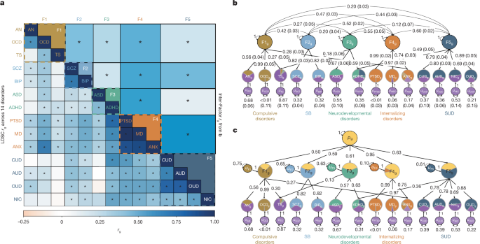 - Genomic structural equation modelling (Genomic SEM) recovered five latent factors: Compulsive, Schizophrenia/Bipolar (SB), Neurodevelopmental, Internalizing and Substance Use Disorders (SUD).