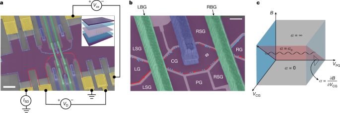 - Device: high‑mobility van‑der‑Waals heterostructure with bilayer graphene encapsulated by hBN and graphite gates; lithographic interference area ≈1 μm2; measurements at 10 mK.