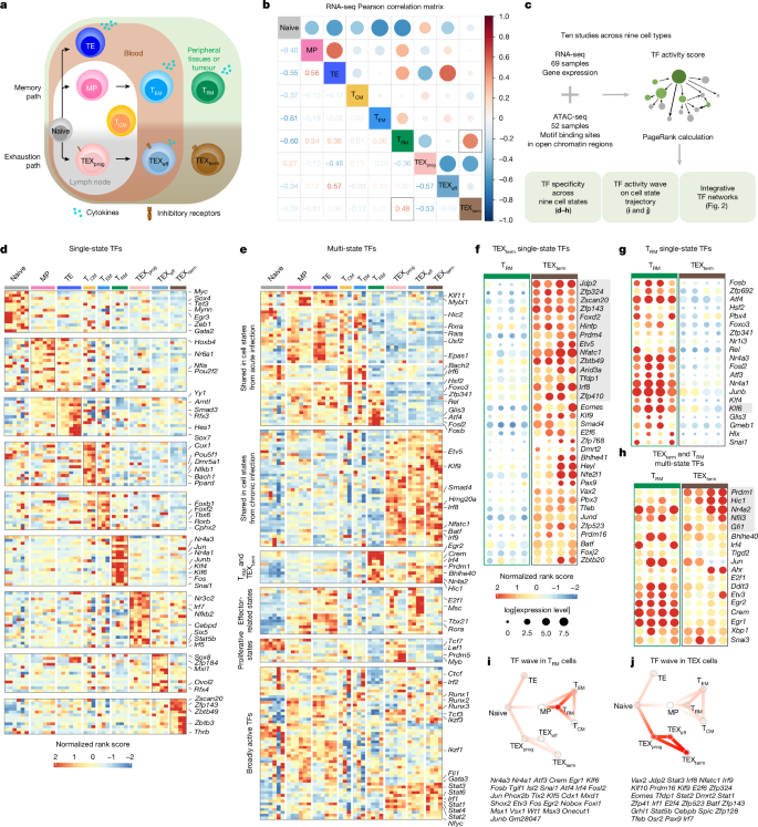 This study builds a multi-omics atlas of nine CD8+ T cell states and uses an integrative pipeline (Taiji) to infer transcription factor (TF) activity from matched RNA-seq and ATAC-seq data. By computing PageRank-based TF activity scores and mapping TF–TF networks, the authors distinguish single-state TFs (state-selective) from multi-state TFs and define coordinated ‘TF waves’. They validate predictions with in vivo Perturb-seq and targeted CRISPR perturbations in mouse infection and tumour models, and with KO experiments in human T cells. Key findings: several novel TEXterm-selective TFs (for example, ZSCAN20, JDP2, ZFP324) drive terminal exhaustion, KLF6 drives tissue-resident memory (T_RM) formation when overexpressed, and targeting exhaustion-specific TFs improves tumour control and synergises with anti-PD1 therapy. The proteasome pathway emerges as a functional hallmark of terminally exhausted T cells.